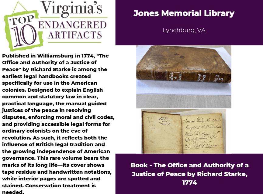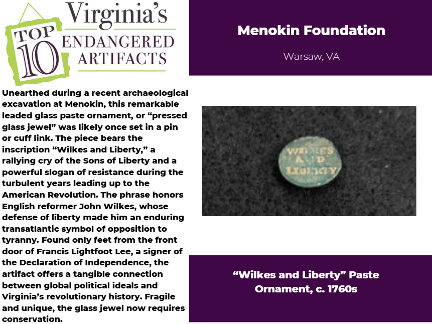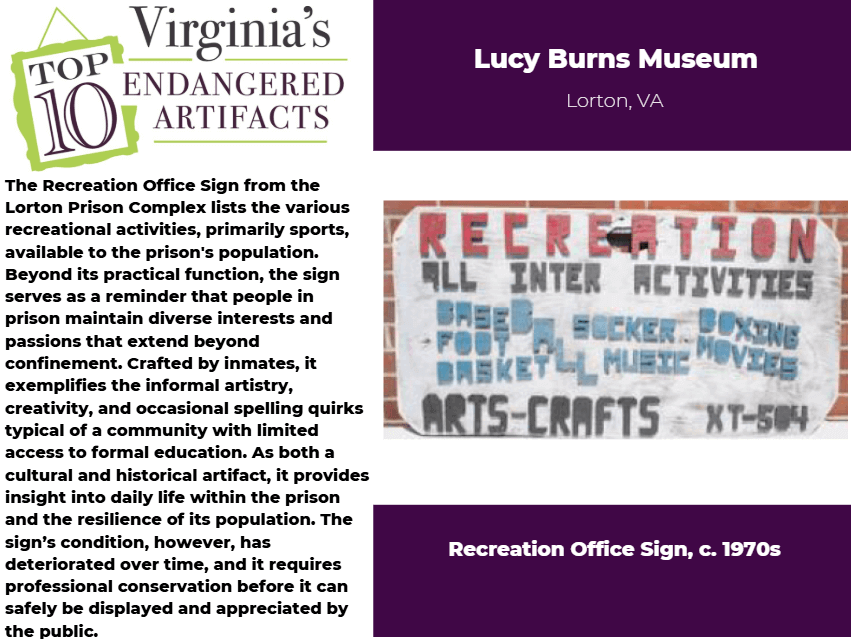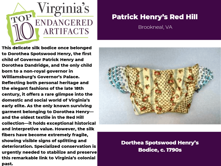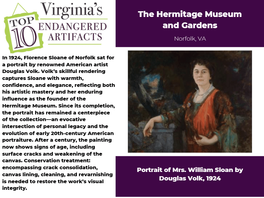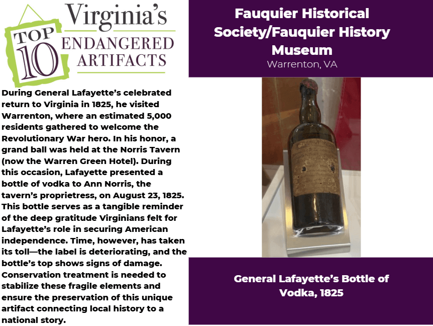 - All Top 10 Honorees will be recognized at the Inaugural Virginia Top 10 Endangered Artifacts Reception, Thursday, January 29 at the Virginia Museum of History & Culture.
