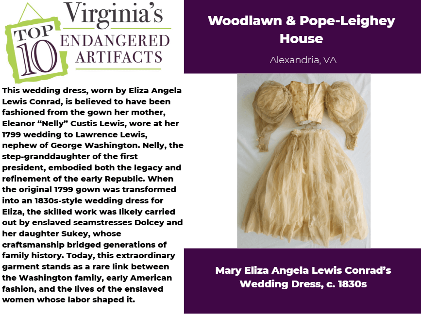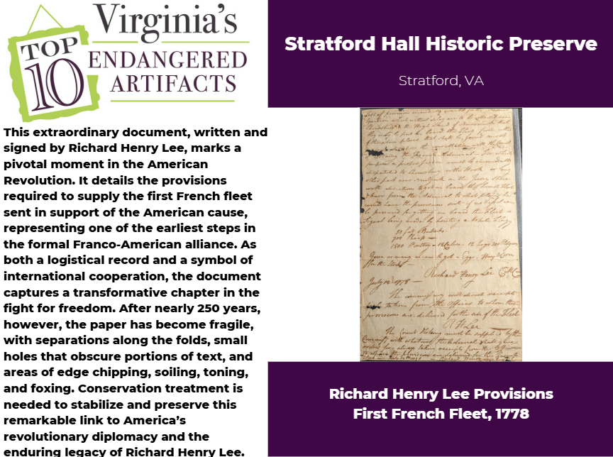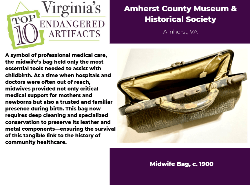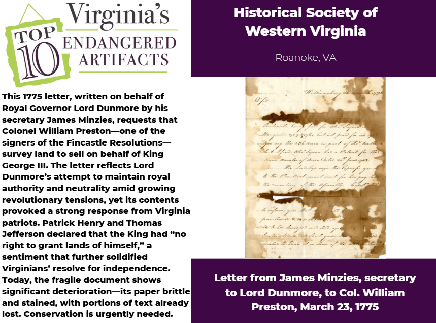 About the Virginia's Top 10 Endangered Artifacts program: Museums, archives, libraries, historical societies, and other collecting organizations in Virginia and Washington, DC submit nominations of endangered artifacts that share the stories, accomplishments, and struggles of the Commonwealth’s history and culture for consideration of selection as an honoree of the 2026 Top 10 Program. VAM’s Top Ten Endangered Artifacts Program has been nationally recognized and replicated by other states while helping more than 200 organizations. The annual top ten list creates a greater awareness of the important and diverse stories told through these rare treasures.